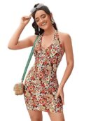 Floerns Women’s Sleeveless Halter Backless Tie Back Floral Bodycon Mini Dress